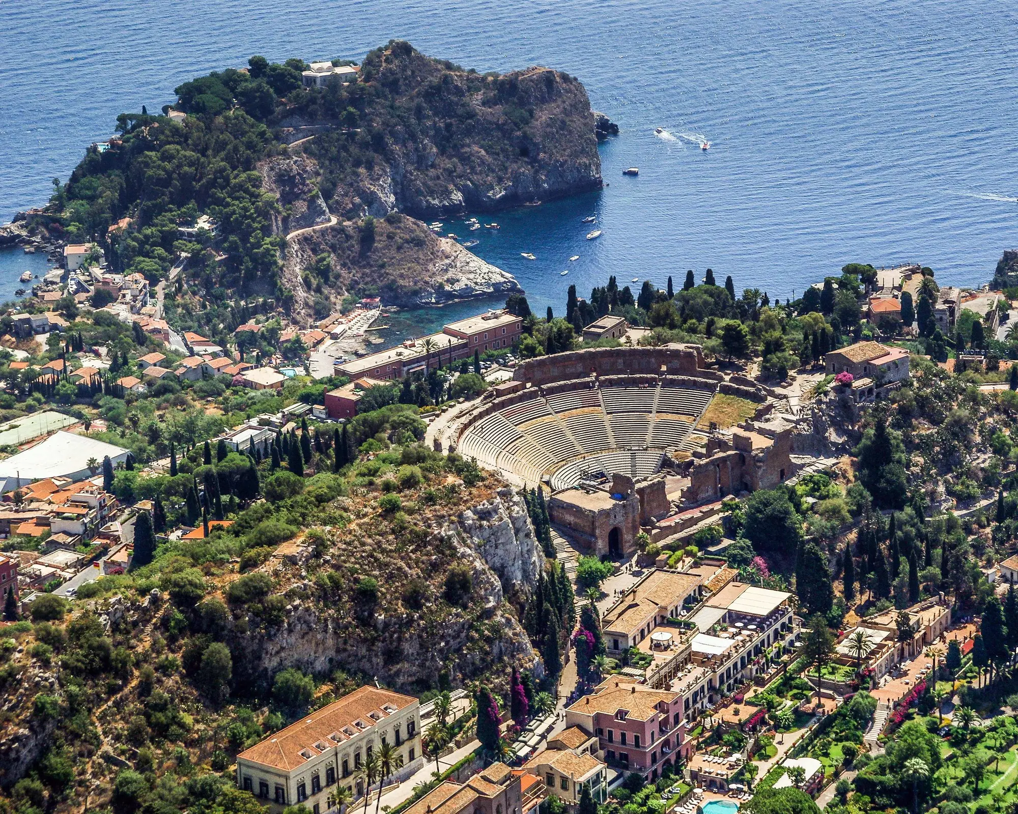 Taormina is a charming hillside town on the east coast of Sicily, Italy and is one of the island's main tourist resorts. Taormina has been a very popular tourist destination since the 19th century. It has popular beaches (accessible via an aerial tramway) on the Ionian Sea, which is remarkably warm and has a high salt content. Since the opening of the first hotel in 1874, Taormina has become one of the world top tourist destinations where visitors can experience a perfect combination of old times charming atmosphere, preservation of history and culture, an elegant and lively way of life to be enjoyed in relaxing walks through the old town pedestrian areas. The tourist has a lot to do and see: top level art performances at the Greek theatre, several painting exhibitions held in local palazzi and churches, fine elegant shopping along the famous “Corso Umberto” with its classical music coffees and pastry shops. Or visiting local art museums, taking naturalistic walks in the surrounding countryside, golfing at the nearby 18-holes green, enjoying the fantastic beaches at easy reach, where the mild Mediterranean climate allows to practice all water sports as swimming, scuba diving, sailing, windsurfing, or just sunbathing for nearly eight months a year and even more.